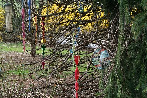 I guess you all have seen these plastic twisty things that spin in the wind. I originally hung up a few to deter squirrels from the bird feeder. Didn’t work. I stopped adding bird food to the feeder, but continued to add twisters as this evergreen is getting rather bare there. It looks a bit like the bottle trees with a new twist! And as my friend said in comments, they are about $1 each at the Dollar Store. They look neater in person I think.