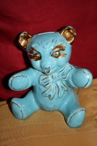 I think he’s a panda and about 10″ tall or so and has real gold paint for trim. I guess they didn’t have pink bear banks. My grandfather died only a few months after I was born, so this holds special meaning to me. It’s getting ‘really old’ and the paint is wearing off in a few spots. I don’t handle it that often and he was on a shelf in my bedroom buried behind eye drops and hand lotion. He is empty at the present time-rats!