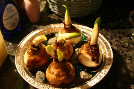 And I am growing an Amaryllis and some Narcissus. I just planted the later and all I had was a pie tin and sea glass-I’ll probably have to find something deeper, but they have no roots on them and were sprouted like this when I bought them. The pinkish salmon Poinsettia is from Terrain.