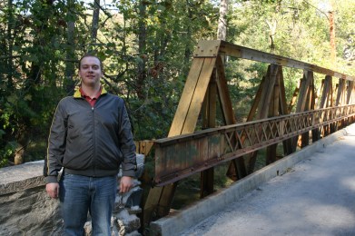 So we encounter this bridge…again the GPS is jumping between both sides of the bridge. We get within a few feet and it goes up. So I look at the hint and it says ‘near the plaque’. Then it’s a piece of cake.