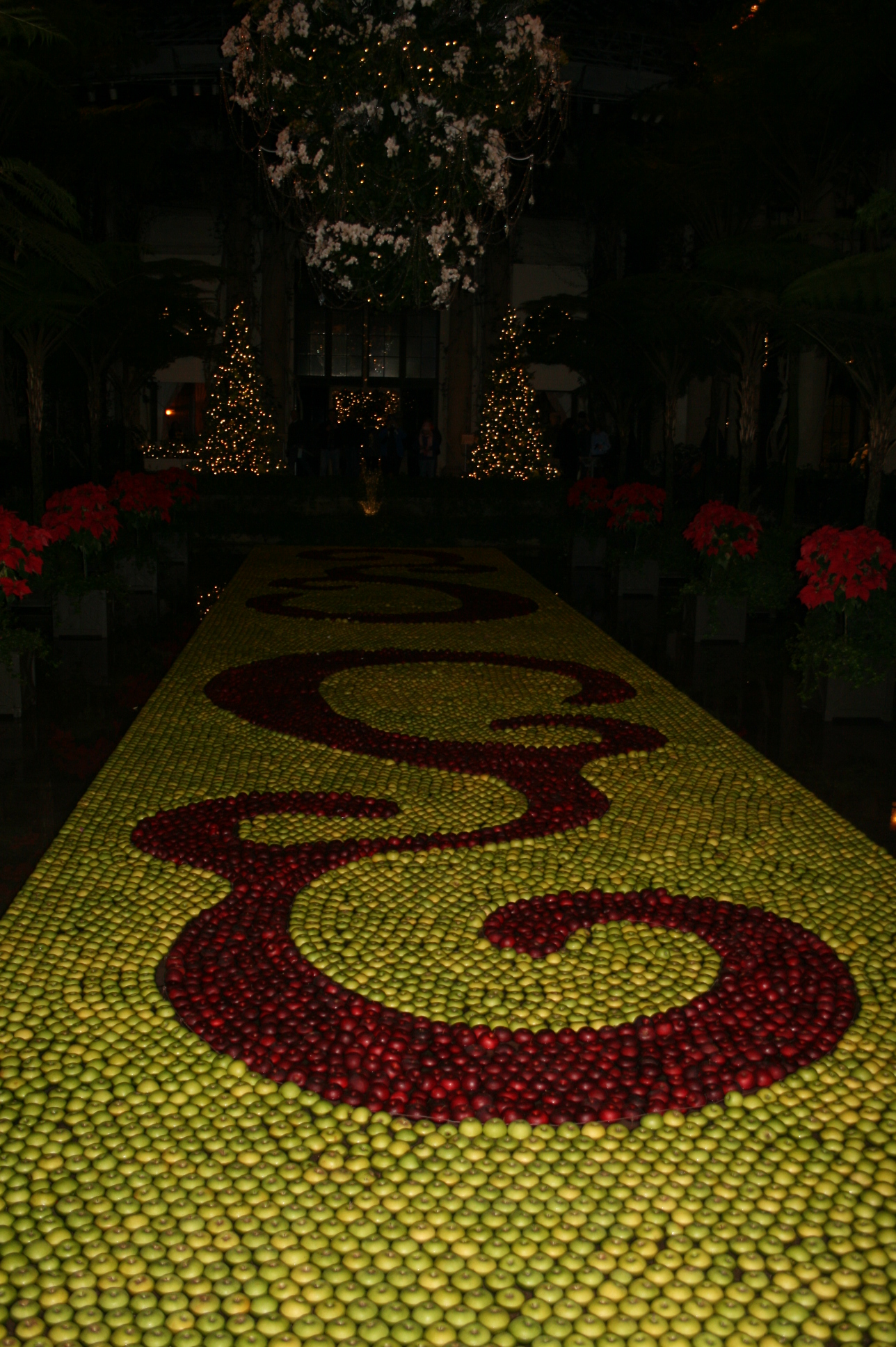 In the conservatory there was a magnificent of red and green apples in a swirl pattern floating in some water. There were over 18 thousand of them.
