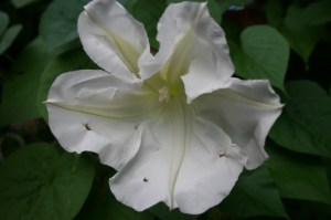 And here it the Moonflower in bloom. It’s had a few more, but I see Mr. Catepillar nibbled some of them…