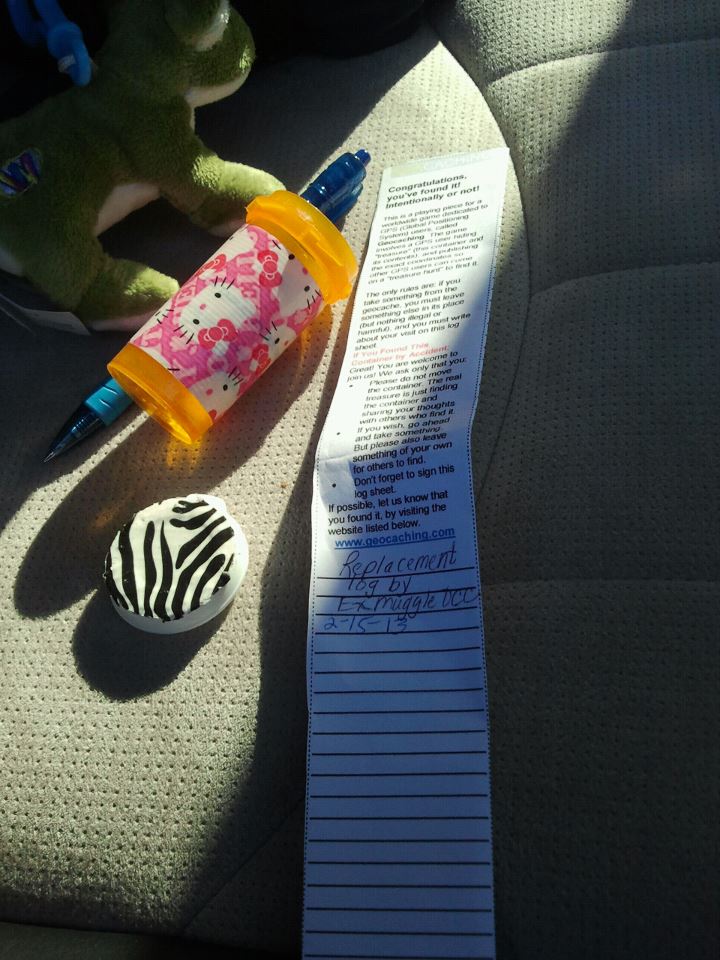 Sean went for an interview up in the city of Lancaster yesterday the 27th. We tagged along hoping the big farmer’s market would be open, but it wasn’t. So we looked for a geocache around the corner. It was opposite a convenience store. We started to look for it and the shop guy poked his head out of the door and said ‘you’re cold’…as we were near a phone pole. He said he could see it from up where he was standing and I backed up a bit-there it was under a smelly trash can (the kind with wheels) ugh.