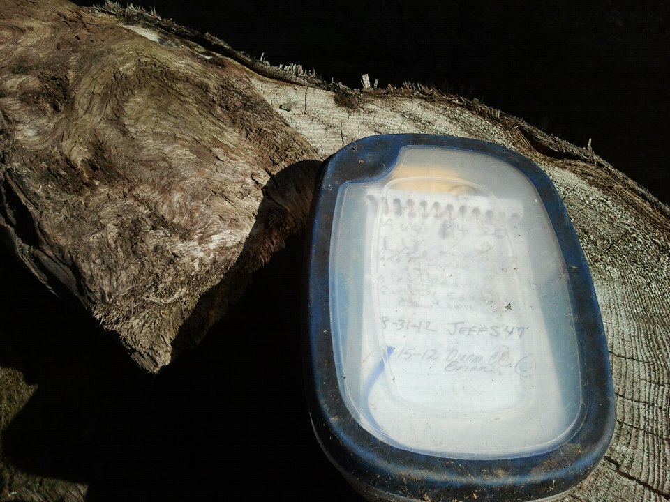 So the next stop was a ‘dog park’. We think we missed the entrance and parked near a back entrance to a business along Rt. 1. We had to bring along a liter of water. There was bushwacking from the road and then some to the cache, leading me to think we missed the entrance. Always nice to see this: